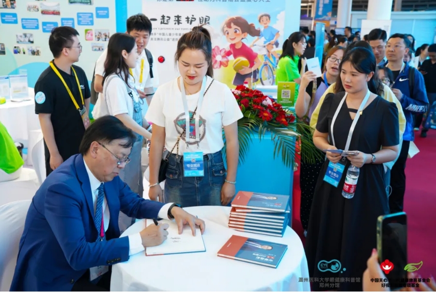 5月17日下午,瞿佳教授來到A23展位為參展觀眾簽贈《近視防控瞿佳2023觀點》,現(xiàn)場學術(shù)熱情滿滿,人們在展位旁排起了長龍。這些書籍不僅為視覺健康行業(yè)從業(yè)者在展開相關(guān)工作時提供了權(quán)威依據(jù)與參考,也讓他們盡覽近些年近視防控工作的熱點與新潮。